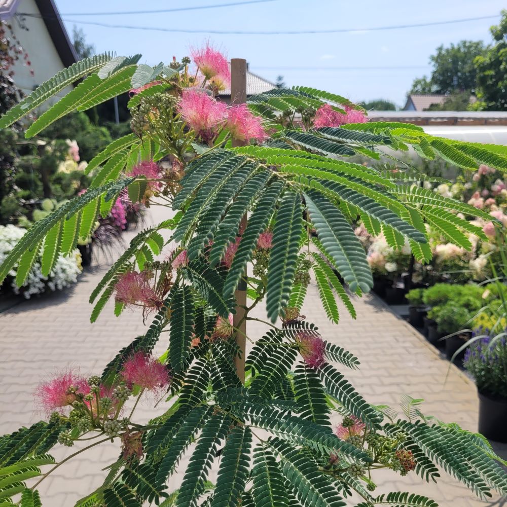 - Pielęgnacja: Albicja nie wymaga intensywnej pielęgnacji. Wiosną warto usunąć uschnięte lub uszkodzone pędy. W przypadku młodych roślin warto je regularnie przycinać, aby uformować ładną, parasolowatą koronę.