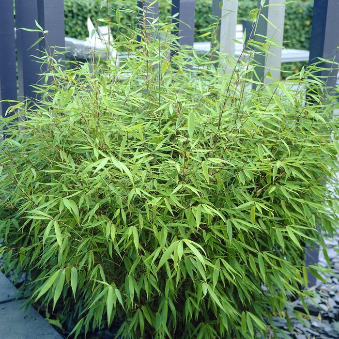 Liście są drobne, wąskie, żywozielone, bardzo liczne – dzięki czemu roślina sprawia wrażenie niezwykle bujnej. Nie opadają na zimę, dzięki czemu bambus zachowuje dekoracyjność przez cały rok. Młode pędy mają efektowny, lekko czerwonawy odcień u nasady, co dodaje im atrakcyjności zwłaszcza wiosną.