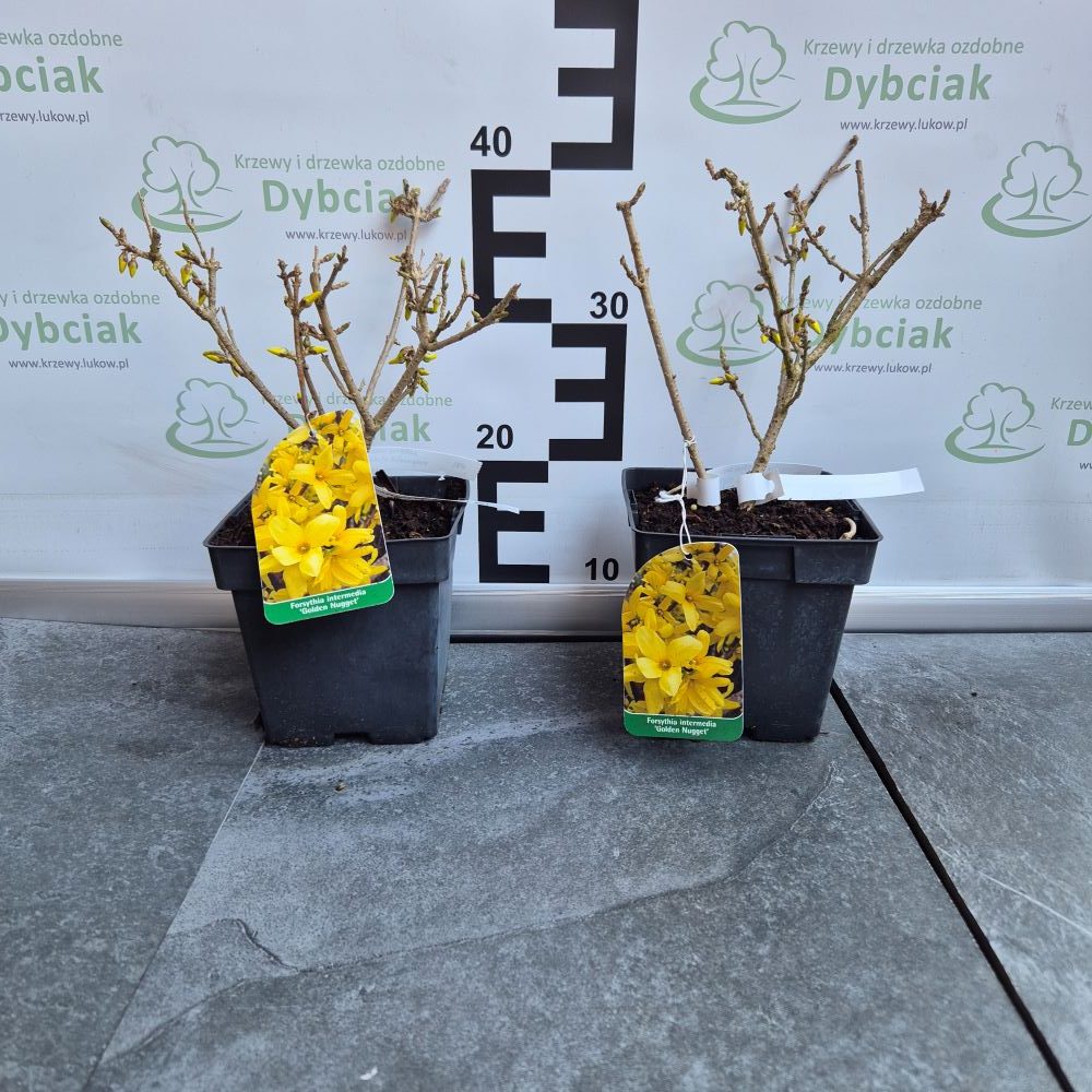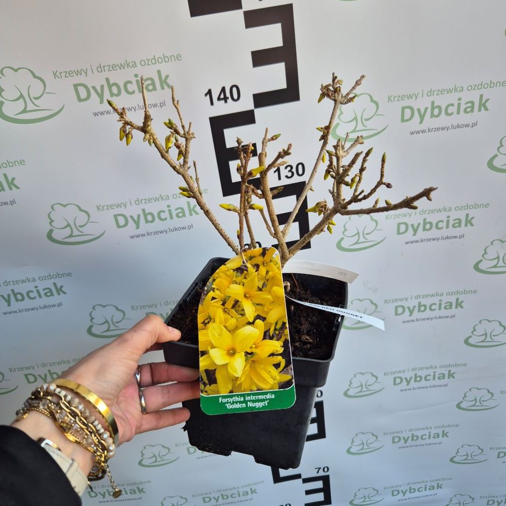 Forsycja pośrednia (Forsythia × intermedia) 'Golden Nugget’ to kompaktowa i dekoracyjna odmiana, która wyróżnia się intensywnie złocistożółtymi kwiatami pojawiającymi się wczesną wiosną. Jest to krzew liściasty o gęstym, zaokrąglonym pokroju, idealny do małych ogrodów, na rabaty oraz do uprawy w pojemnikach.
