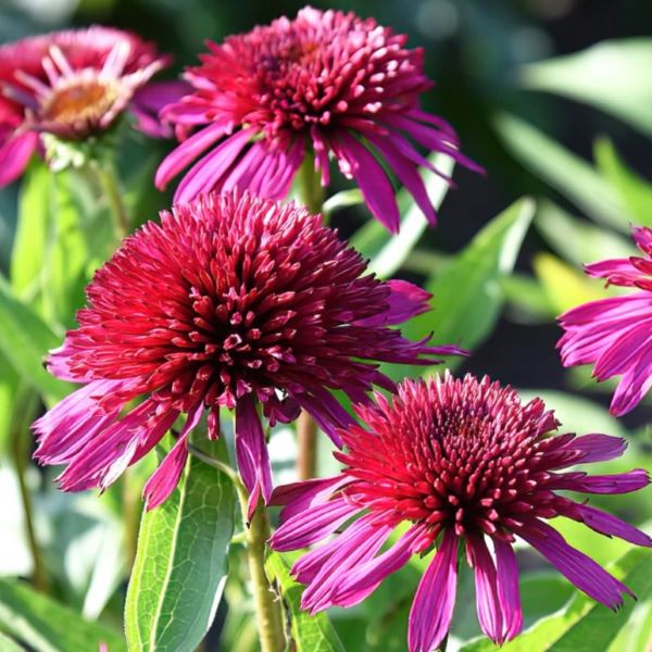 - Kwiaty: Duże, intensywnie wybarwione – płatki mogą mieć odcienie czerwieni, fioletu i różu. Co wyróżnia tę odmianę, to fakt, że środek kwiatostanu ma ten sam kolor co płatki, co nadaje roślinie wyjątkową, jednolitą kolorystykę. Płatki są lekko opadające, co jest charakterystyczne dla jeżówek.