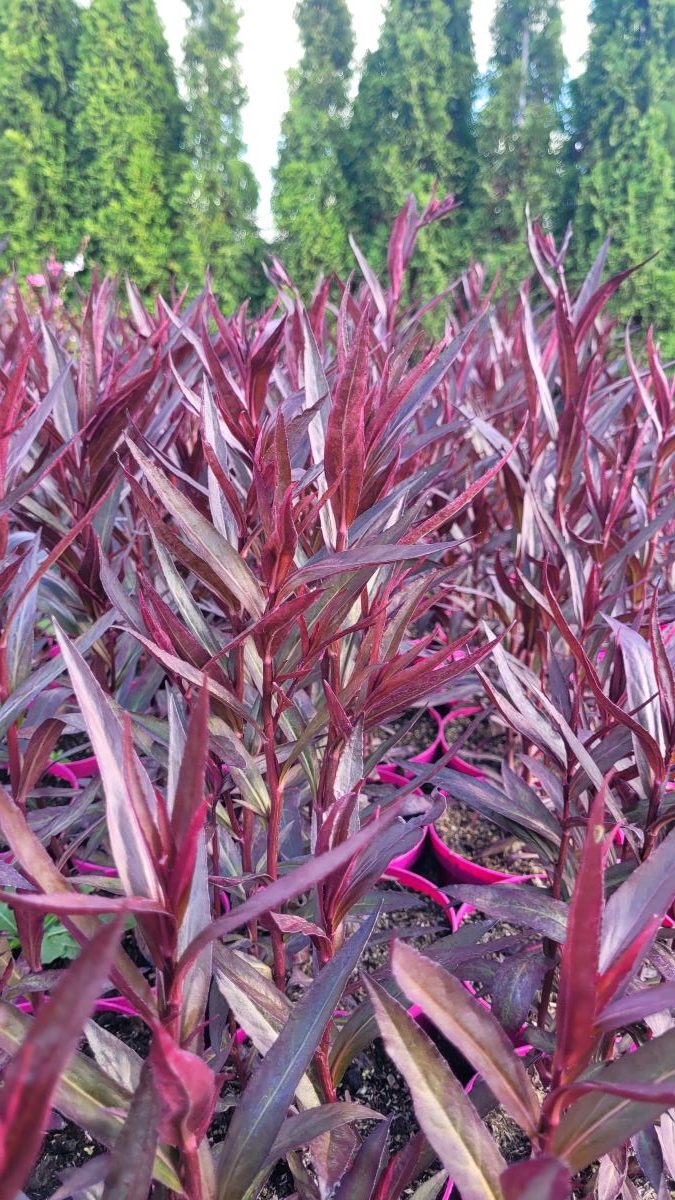 Liście są lancetowate, ostro zakończone, o unikalnej, czerwonofioletowej barwie, która pięknie kontrastuje z kolorem kwiatów i sprawia, że roślina jest dekoracyjna przez cały sezon.