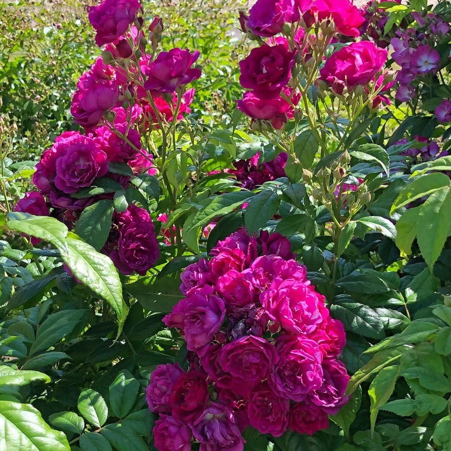 Róża pnąca  to wyjątkowa odmiana o intensywnie fioletowych, półpełnych kwiatach, które gęsto pokrywają cały krzew.