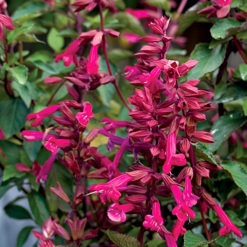 Szałwia 'Wendy’s Wish’ to niezwykle efektowna, kolekcjonerska roślina, która wyróżnia się na tle innych szałwii swoimi ogromnymi, neonowo-różowymi, rurkowatymi kwiatami. Osiąga wysokość około 60–90 cm, tworząc rozłożyste, ale sztywne kępy. Jej pędy mają charakterystyczny, bordowo-brązowy kolor, który wspaniale kontrastuje z dużymi, ciemnozielonymi i ząbkowanymi liśćmi. W przeciwieństwie do szałwii omszonej, ta odmiana ma bardziej tropikalny charakter i kwitnie nieprzerwanie od późnej wiosny aż do pierwszych przymrozków.