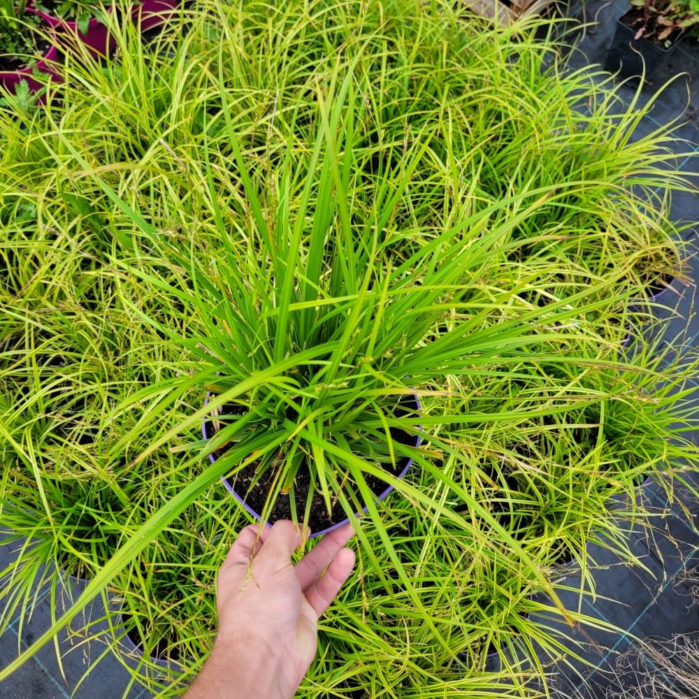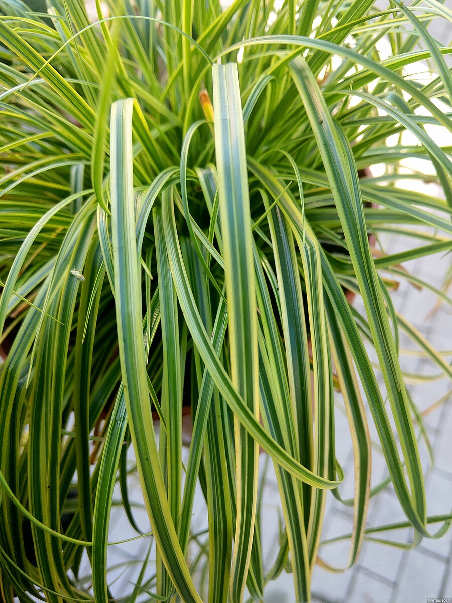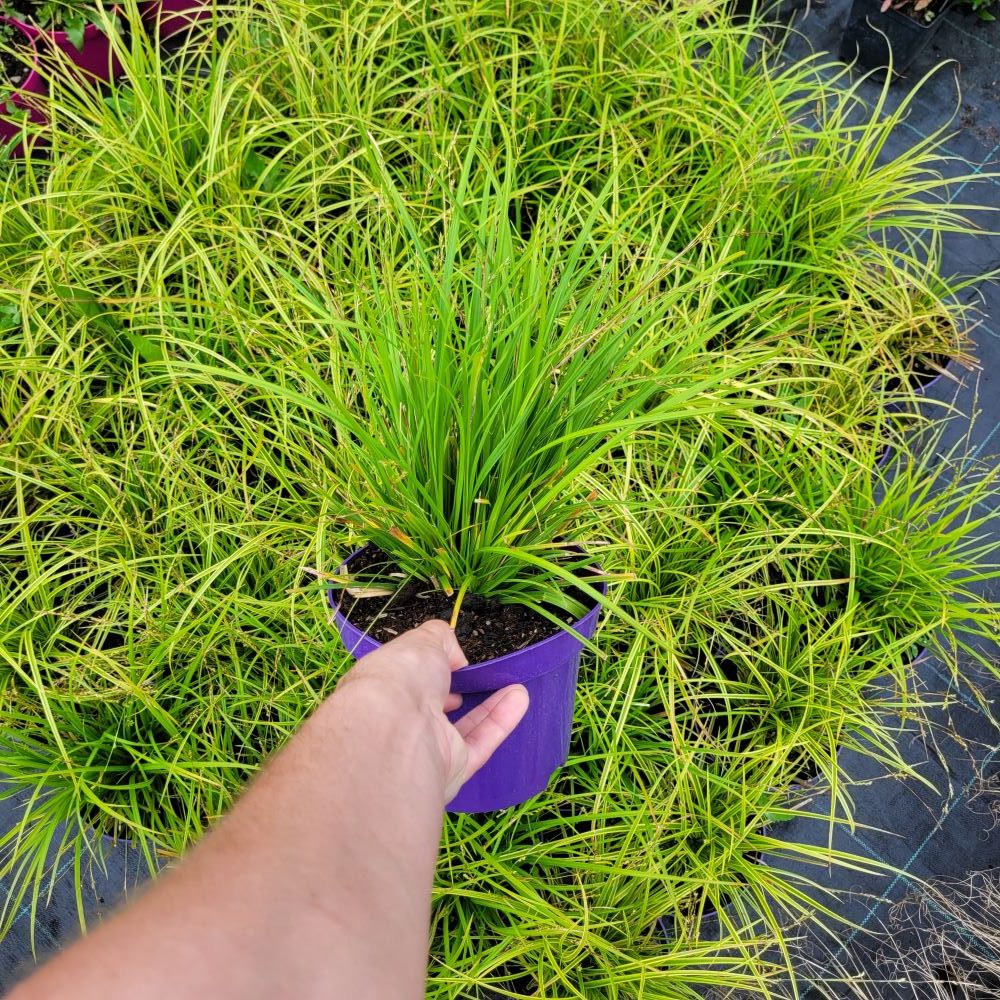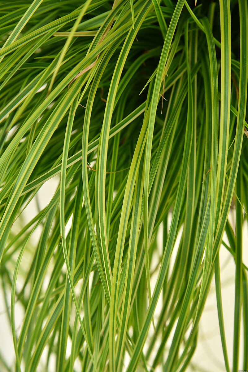 Turzyca 'Gold Fountain’ (znana również pod nazwą 'Kaga-nishiki’) to roślina o wyjątkowo subtelnym i wyrafinowanym wyglądzie. Zgodnie ze swoją nazwą, tworzy gęste, regularne kępy, które przypominają fontannę tryskającą złotem. Jej liście są bardzo wąskie, nitkowate i malowniczo przewieszają się aż do samej ziemi. Każde źdźbło ozdobione jest delikatnym, złocistym marginesem, co nadaje całej roślinie efekt świetlistej, ażurowej chmury. Jest to odmiana zimozielona, co sprawia, że jej lekka, fontannowa sylwetka zdobi ogród przez cały rok.