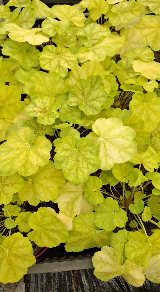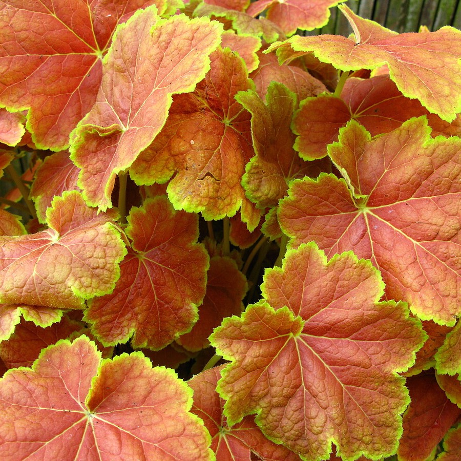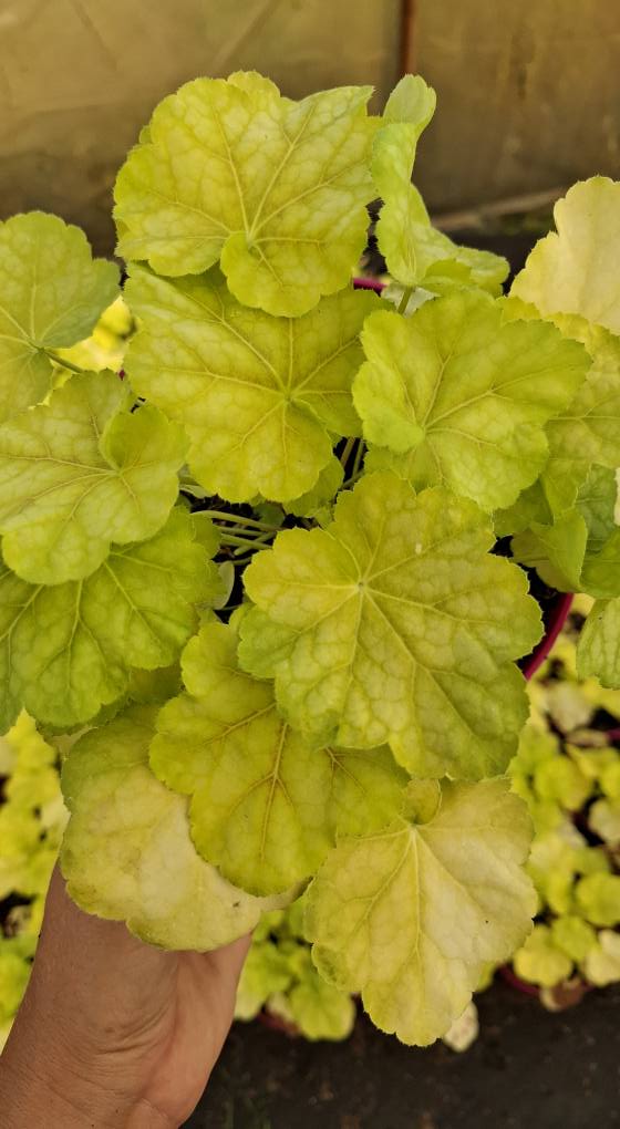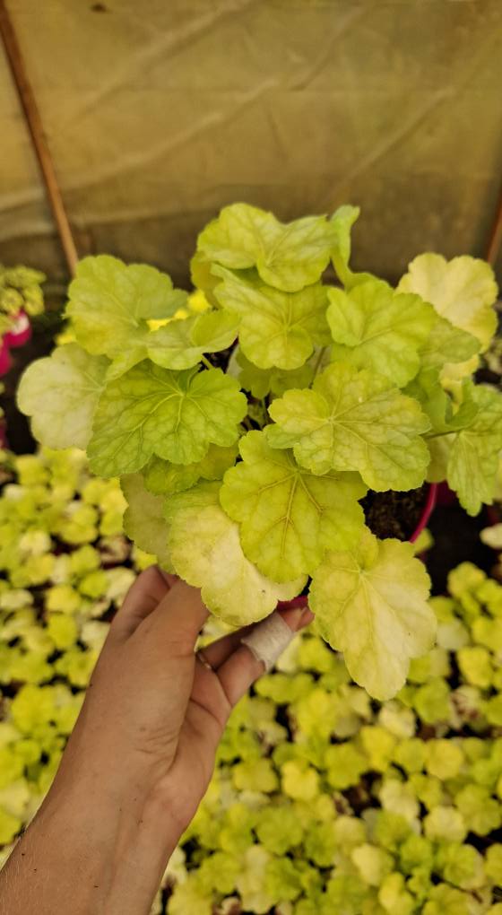 Żurawka 'Tiramisu’ to fascynująca, wieloletnia bylina o zwartym, niemal idealnie kulistym pokroju, osiągająca około 20–30 cm wysokości. Jest ceniona za swoją niesamowitą zmienność kolorystyczną. Wiosną liście przybierają barwę intensywnego żółtego złota z wyraźnym, ceglastoczerwonym unerwieniem promieniującym ze środka. Latem kolory stają się bardziej stonowane, przechodząc w odcienie jasnej zieleni z delikatnym, srebrzystym nalotem, by jesienią powrócić do ciepłych, bursztynowych i miedzianych tonów.